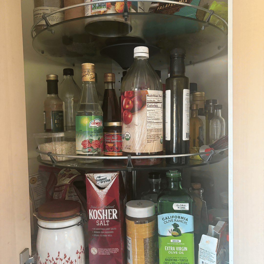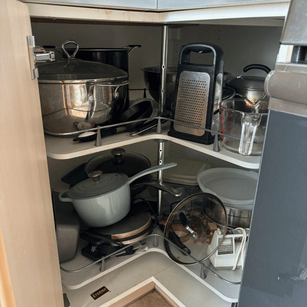 DIrty Pans, filthy shelving, unorganized and mismatched items