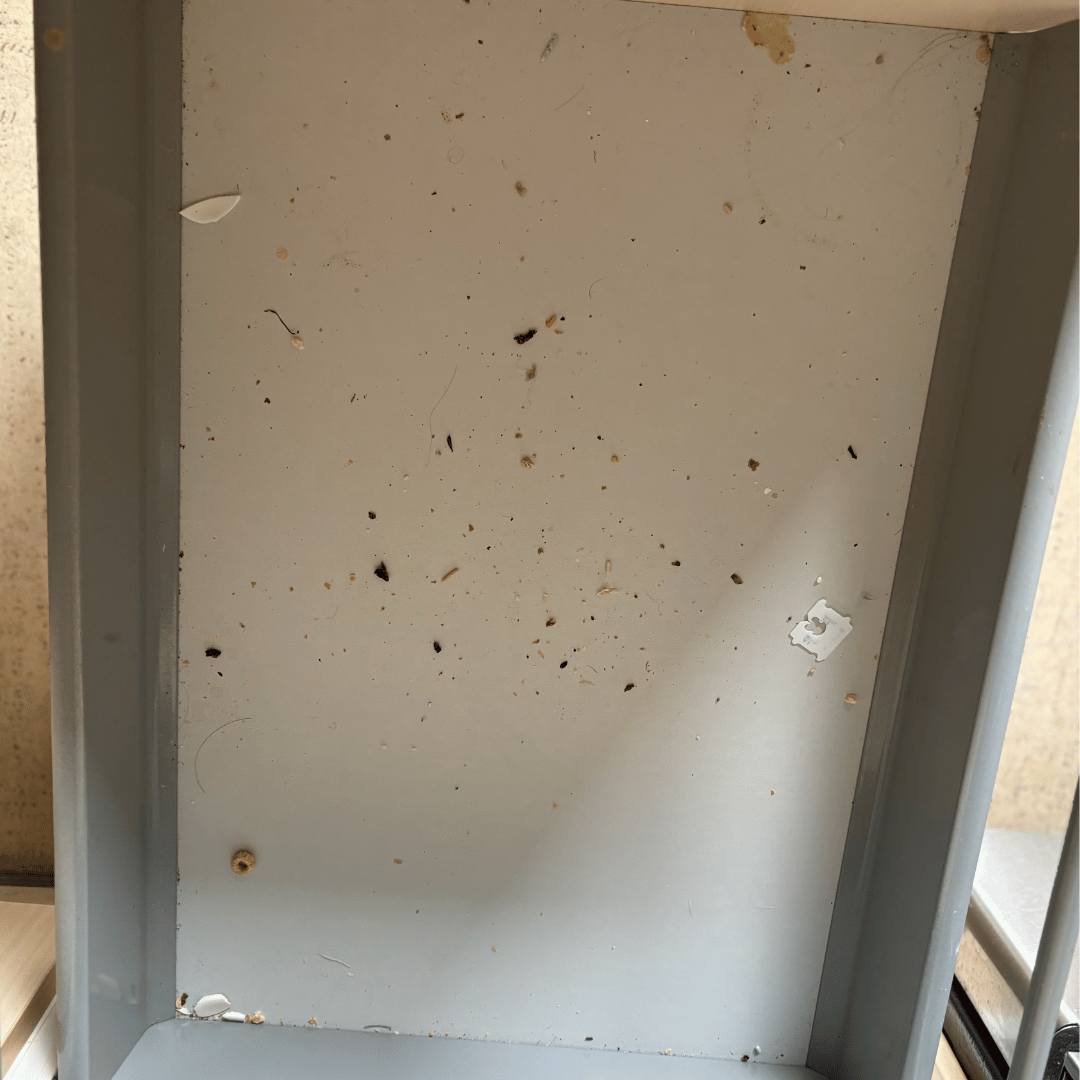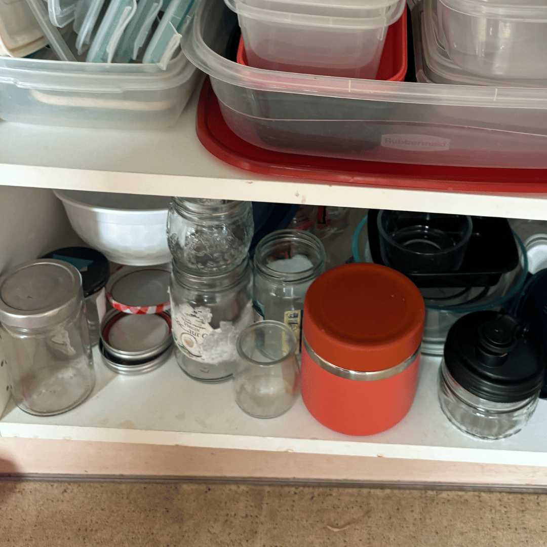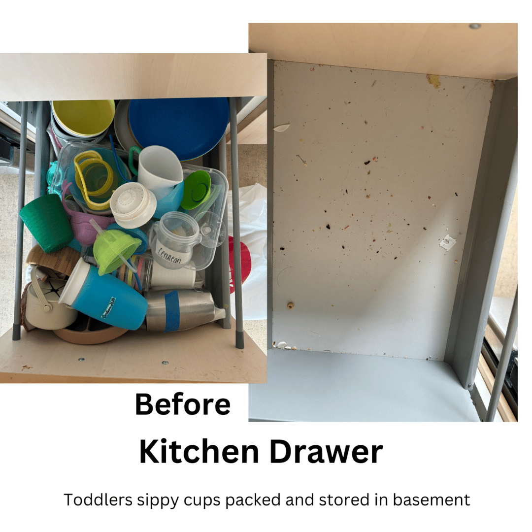 Toddlers' dirty and mismatched cups, lids with no cups. Bottom of the toddlers' drawer
